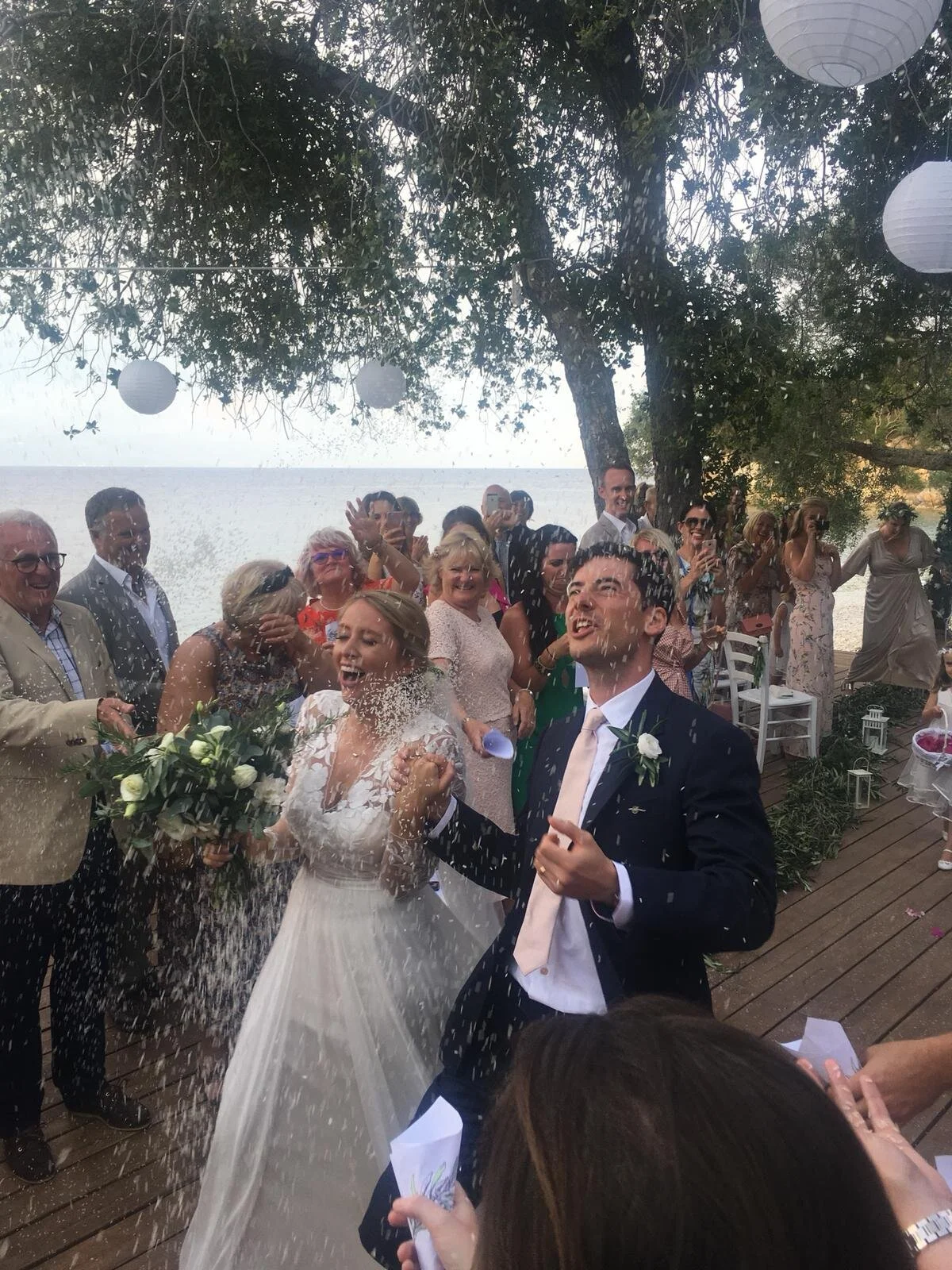 We held our ceremony in the Daughter’s field, a picturesque olive grove with an old ruin serving as an entrance, elegantly decorated by Sam and Spyros of Taxidi Bar. Spyros also provided guests with Prosecco and the most delicious fresh lemonade after the ceremony. Stuart was always at hand, ensuring that everything ran smoothly. Our reception was held a 20 minute walk from the ceremony at the Mongonissi Taverna at the southern tip of Paxos. Theo, the owner, and the staff were so generous and we had the most delicious meal. Sam had decorated everything beautifully, right down to the elegant lanterns hanging from the olive trees and the beautiful array of handpicked flowers from her garden laid at each table place. Mongonissi were incredibly flexible and allowed us to have our friends’ band play and DJ until the early hours, and even surprised us with fireworks immediately after our first dance. All of our guests and the staff had a great time. Sam and Stuart stayed right up until the end, making sure every bit of our day went to plan.